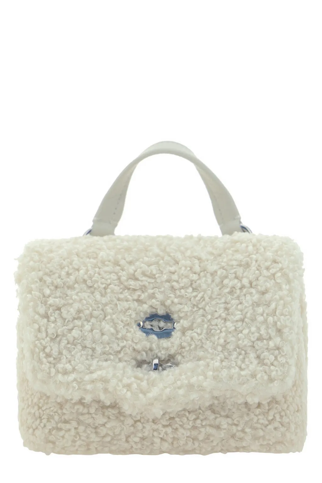 A fluffy white top handle bag with a silver clasp closure and a single top handle.