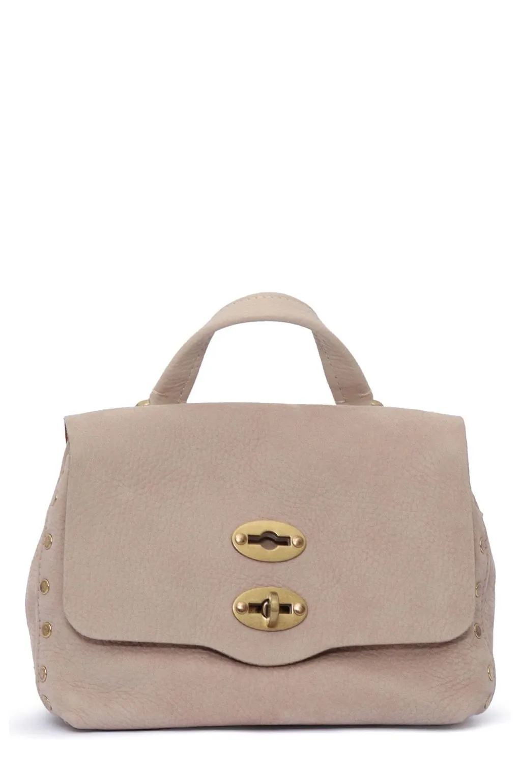 DescriptionA small beige handbag with a top handle and a detachable shoulder strap. The bag features a flap closure with two gold-toned turn-lock closures. It is adorned with small gold-toned eyelets along the sides. The back of the bag is plain.