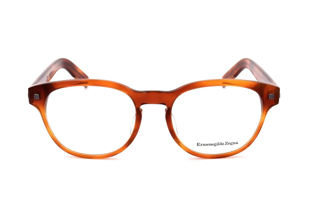 These eyeglasses feature a classic round shape with a tortoiseshell acetate frame. The temples are adorned with the ermenegildo zegna logo. Made in italy.