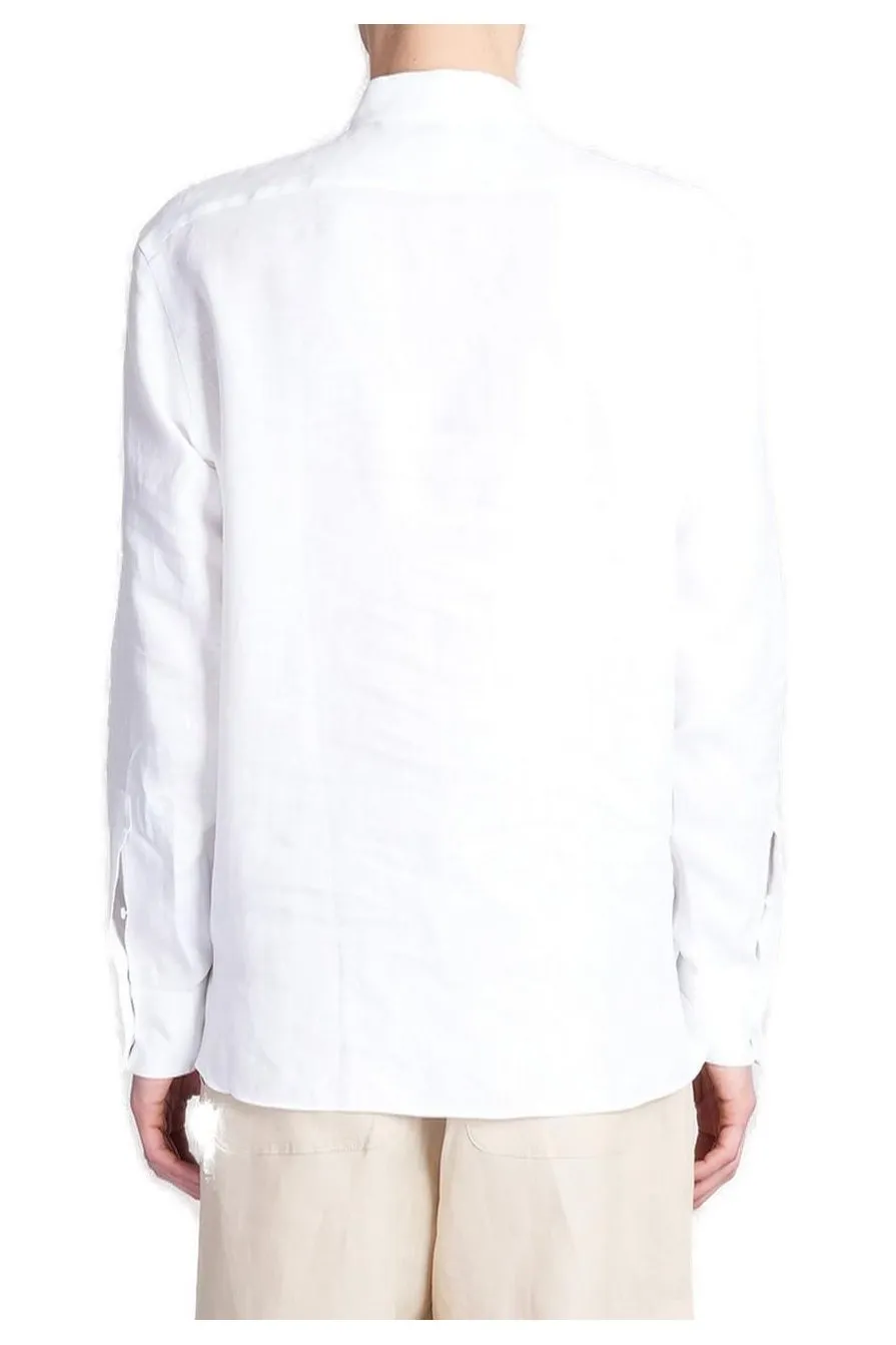 A classic white long-sleeved shirt with a band collar. The shirt features a concealed button placket and a clean, minimalist design. It is paired with light-colored shorts.