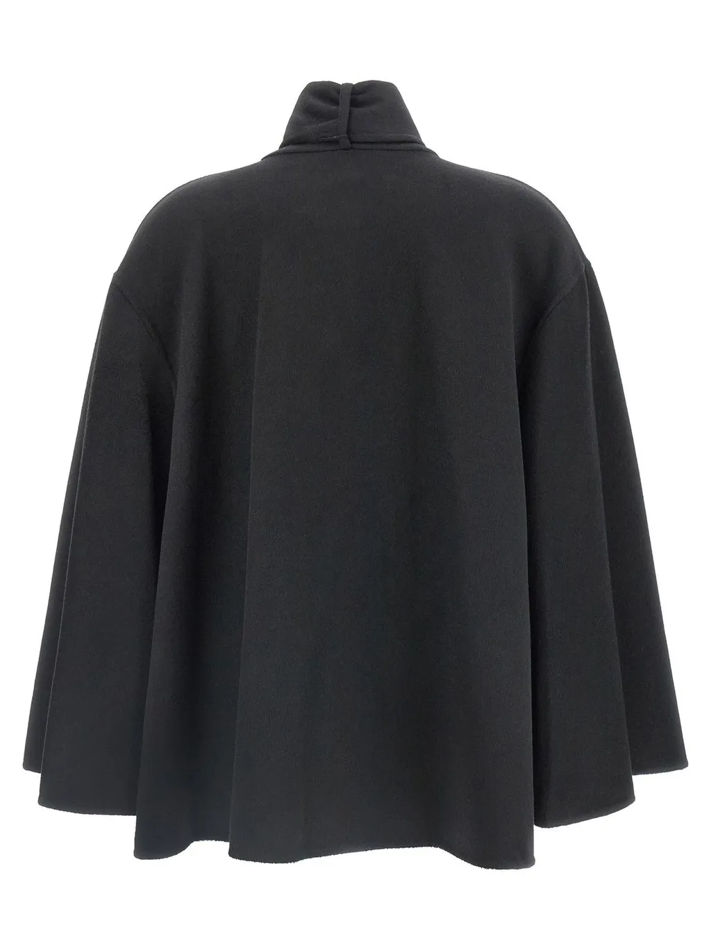 A black cape coat with a high neckline and a large bow detail at the front. It features a button-down closure and two front pockets. The silhouette is a-line, flaring out from the shoulders.