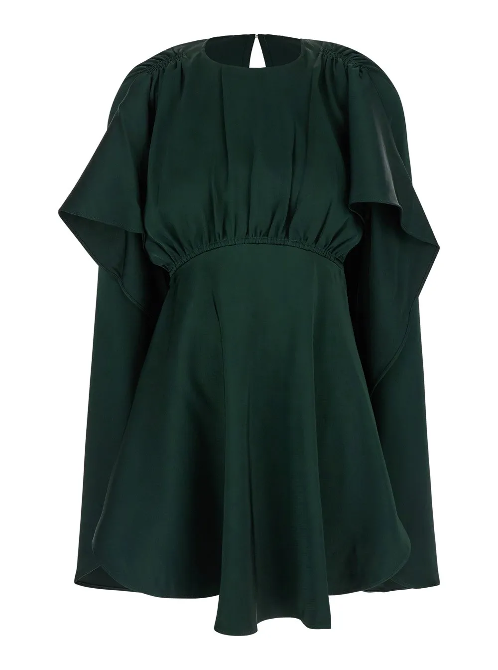 DescriptionA dark green, knee-length dress with a high neckline and a keyhole back closure. The dress features a fitted bodice with gathered detailing at the shoulders, creating a cape-like effect that drapes over the arms. The skirt is a-line and flares out from the waist.