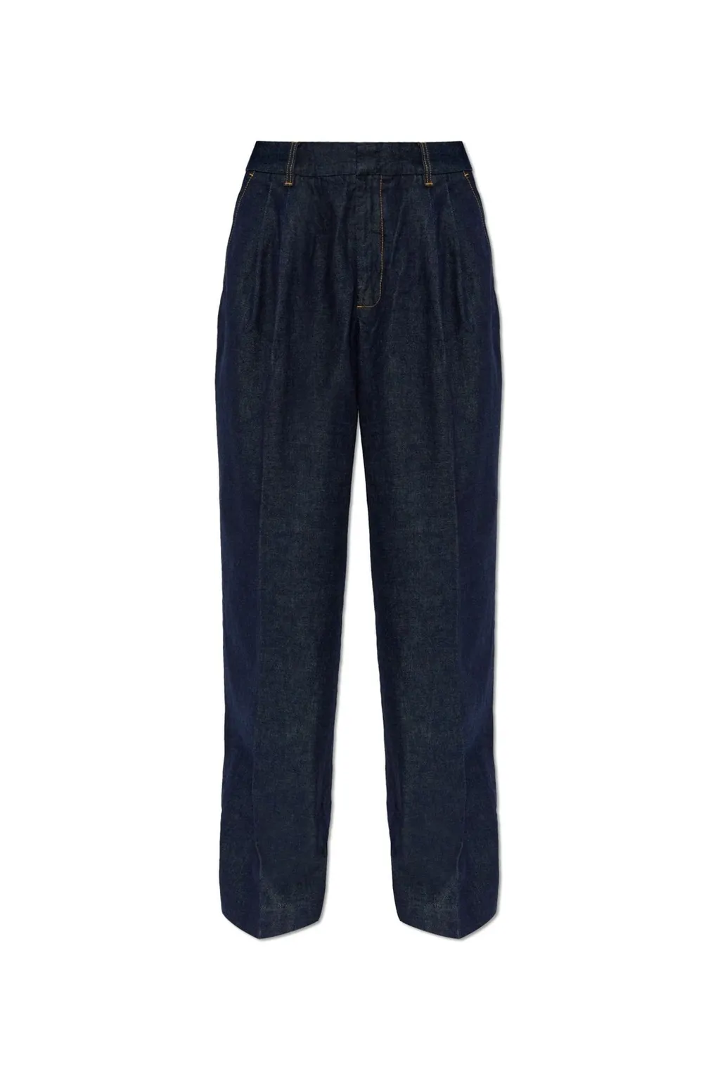 Dark blue denim trousers with a high-rise waist and a pleated front. The trousers have a straight leg silhouette and a relaxed fit. Features include belt loops and a zip fly with button closure.