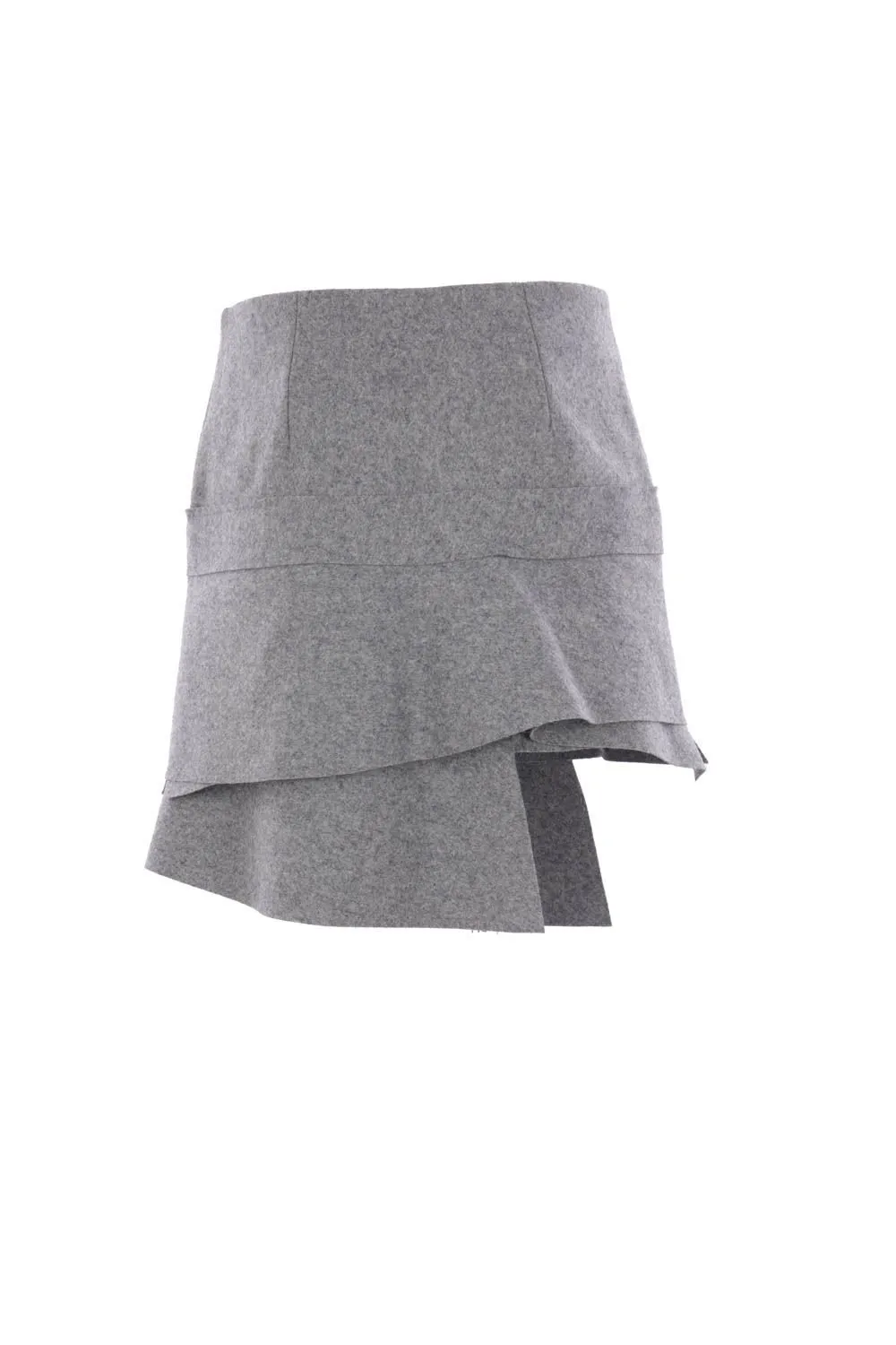 A grey wool skirt with an asymmetric hemline and a layered, draped effect. It features a single button closure and a subtle pocket detail on the left side.